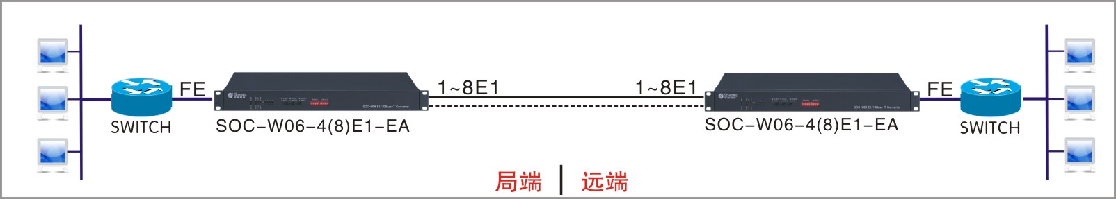 SOC-W06系列協(xié)議轉(zhuǎn)換器(又稱網(wǎng)橋)是利用E1線路作為鏈路傳輸,以太網(wǎng)數(shù)據(jù)下掛業(yè)務的通信設備??奢p松地通過廣域網(wǎng)實現(xiàn)兩個分離的局域網(wǎng)間的互連,方便地擴大了局域網(wǎng)的地域范圍;在遠程組網(wǎng)、異地辦公室聯(lián)網(wǎng)、遠程監(jiān)控等領域有著廣泛的應用;并且構