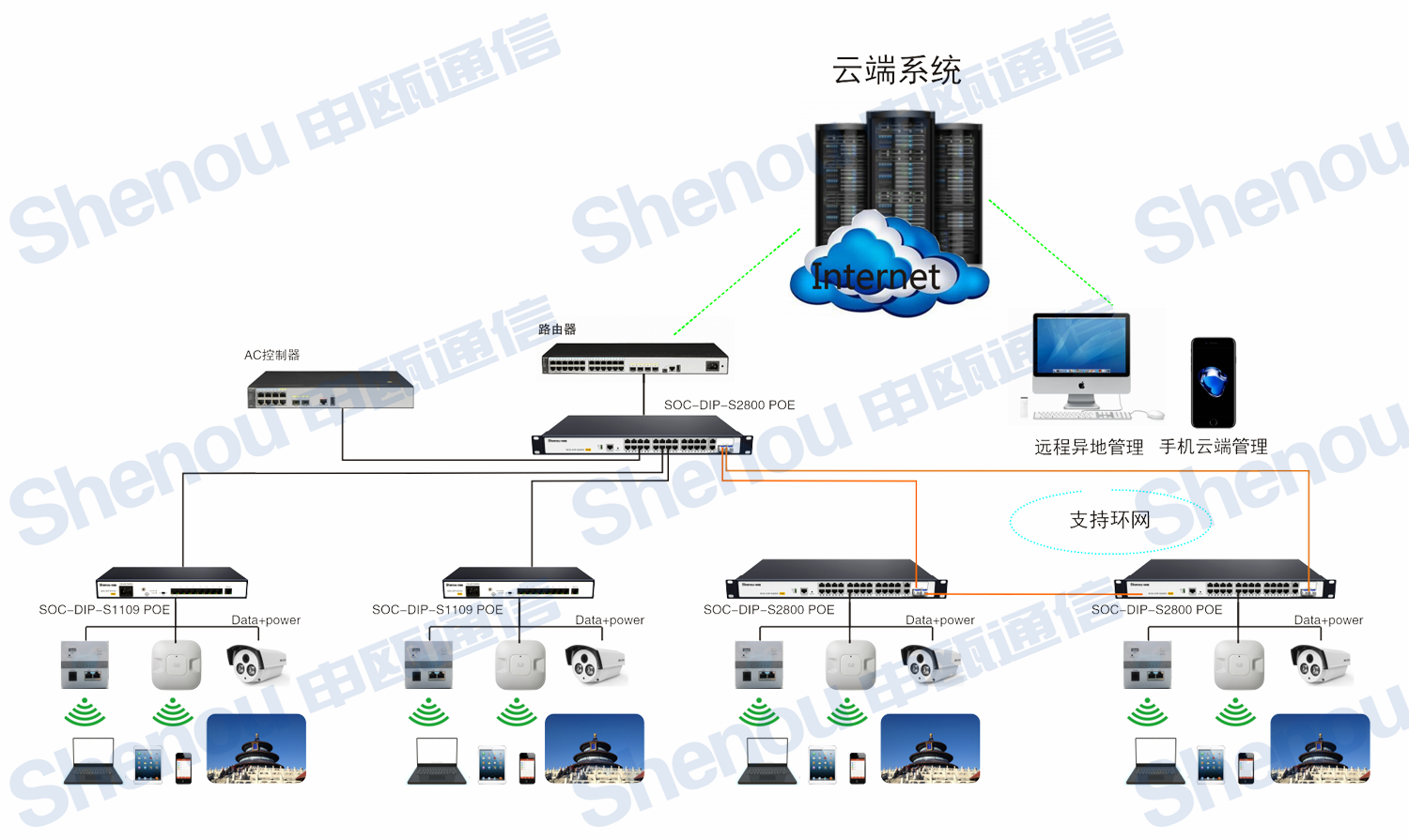 PoE交換機(jī)是以太網(wǎng)供電交換機(jī),在不改變原有網(wǎng)絡(luò)架構(gòu)的基礎(chǔ)上通過現(xiàn)有的以太網(wǎng)雙絞線纜提供網(wǎng)絡(luò)終端設(shè)備所需要的直流電源。通常為無線AP、網(wǎng)絡(luò)攝像頭、網(wǎng)絡(luò)電話機(jī)、掌上電腦等PoE終端設(shè)備供電。申甌PoE交換機(jī)采用研發(fā)技術(shù),具有完備網(wǎng)絡(luò)功能外,提供了超長距離的數(shù)據(jù)傳輸與供電能力,距離可達(dá)100米,不僅節(jié)省了電力線,而且可以使無線AP與網(wǎng)絡(luò)監(jiān)控設(shè)備工程的安裝更為靈活。